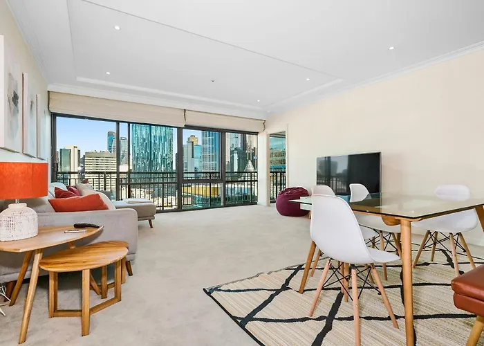 Located 15 minutes on foot from Flinders Street railway station, Horizon On Russell - With Indoor Pool And Gym Apartment Melbourne is 600 metres from the vast 19th-century Gothic St Patrick's Cathedral. Boasting a location within easy reach of Chinatown, this spacious 98 m² apartment provides guests with a hot tub and an indoor pool.